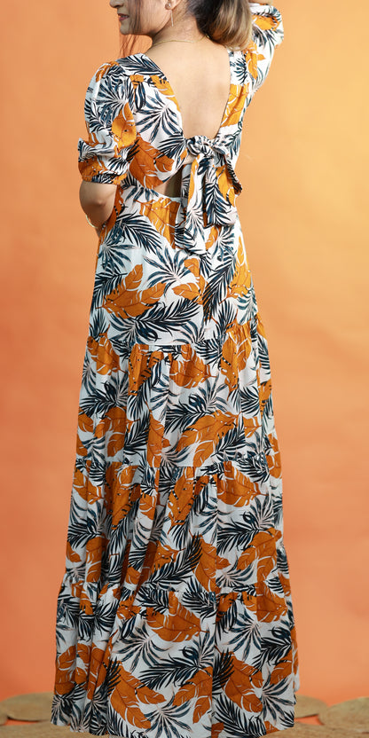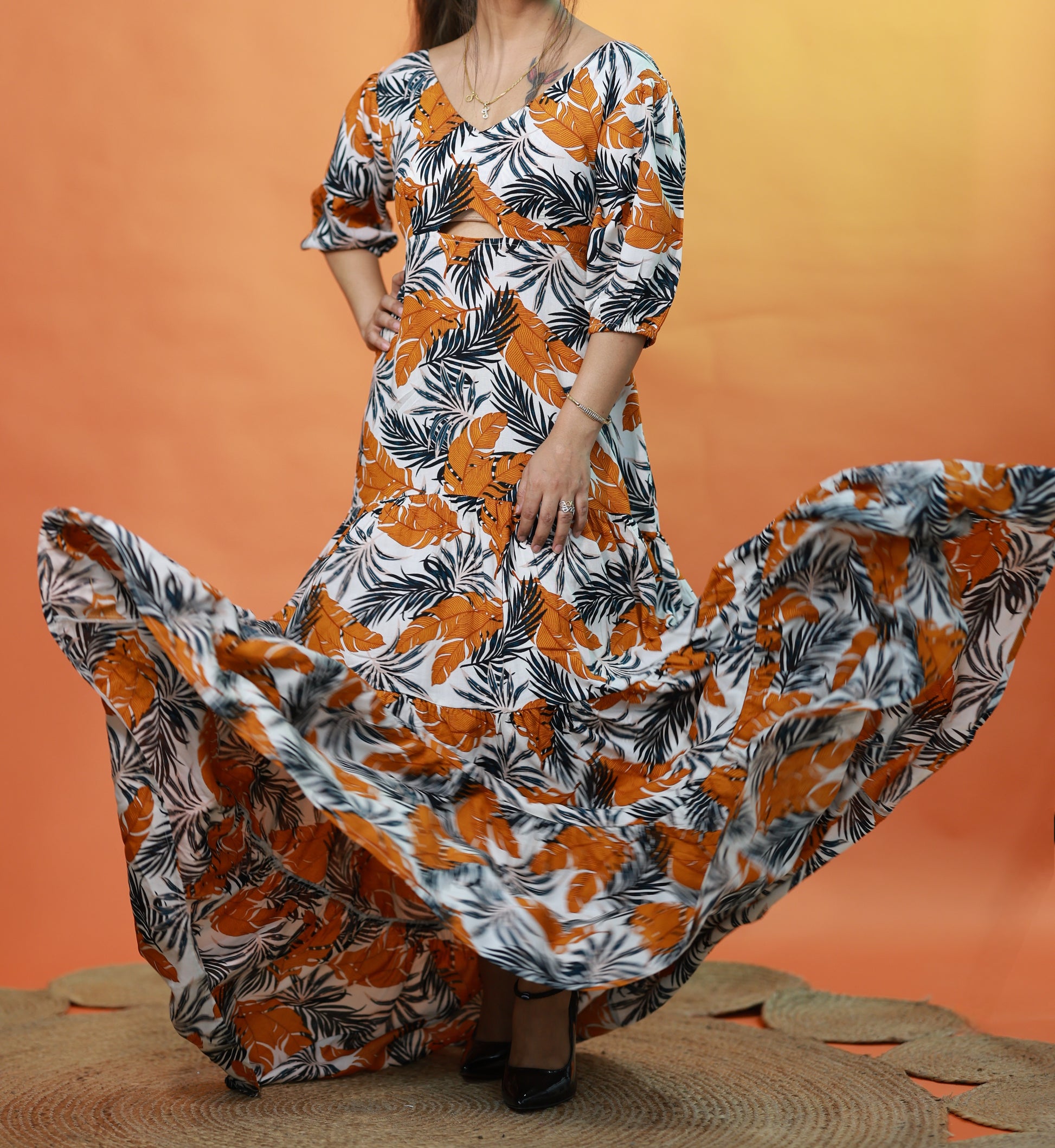 Embrace effortless summer style with this maxi-length floral printed tiered dress, designed to keep you cool and stylish all season long. A flattering triangle cut-out detail under the bust adds a touch of allure, while the tie-up back ensures a customizable, feminine fit. The soft rayon fabric flows beautifully through tiered layers, enhancing movement and creating volume. With elbow-length sleeves and a timeless V-neckline, this dress is perfect for beach days, brunch outings, or any warm-weather soirée.